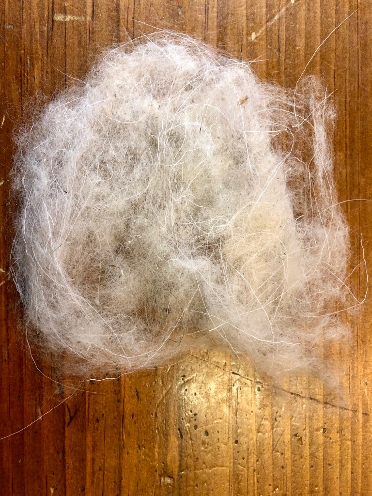 Last year I combed them out a little late and lost some of the most wonderful Cashmere wool. I sent it off to the mill: The Fleece Factory of the Rockies in La Salle, CO https://www.thefleecefactoryoftherockies.com and had it turned into lace-weight yarn. I got back four and a half skeins that were 200 yards each. I had forgotten to weigh the raw wool before sending it off, and I still need to weigh each skein, as I would like to know how many ounces of Cashmere roughly = a 200 yard skein of lace-weight yarn. Lessons learned! π Keeping in mind that raw wool weighs quite a bit more than the finished yarn as it contains guard hairs and a little sand and such. I skirt my wool fairly well to remove as much VM (vegetable matter – old hay and such) as I can.